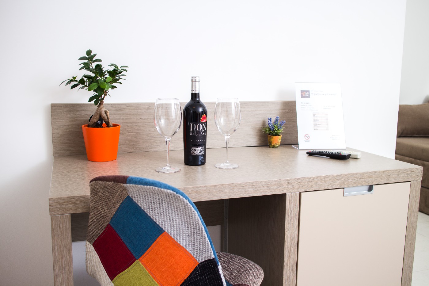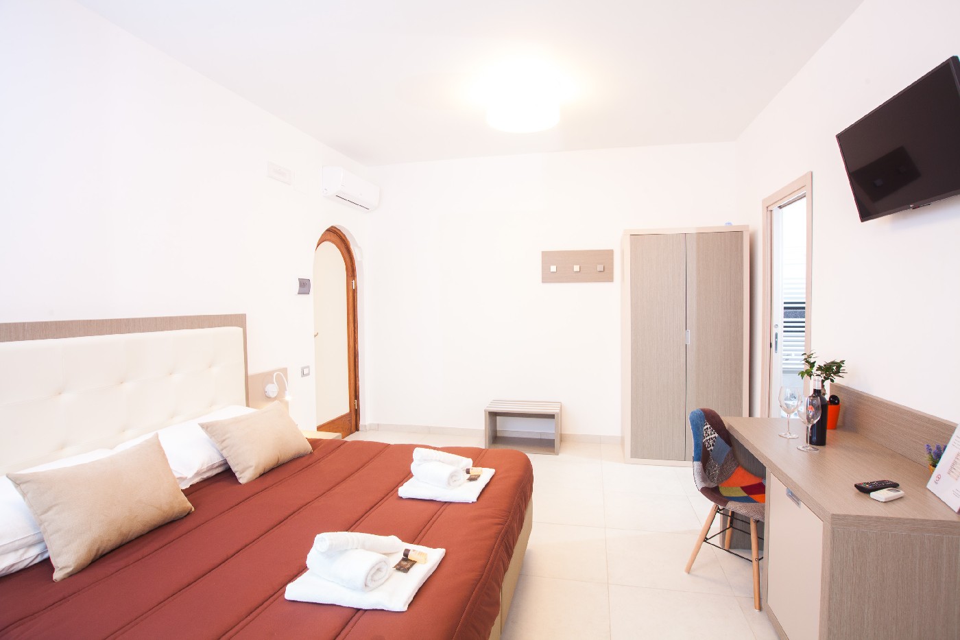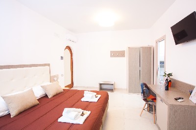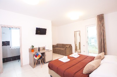 Le nostre suite sono dotate di un letto matrimoniale e un divano-letto a castello, e dispongono di ogni comfort: balcone privato con vista sull'uliveto, minibar, aria condizionata caldo-freddo, cassaforte, TV LCD satellitare, internet WiFi, asciugamani, kit cortesia, e ovviamente bagno privato con doccia.